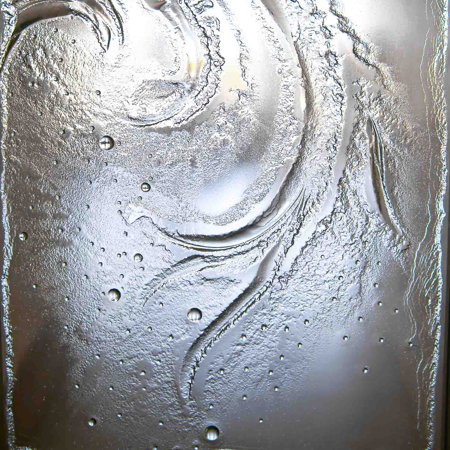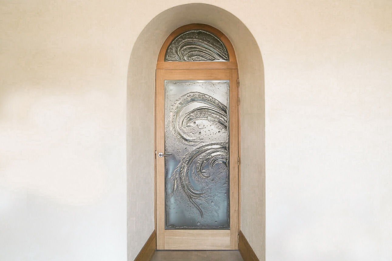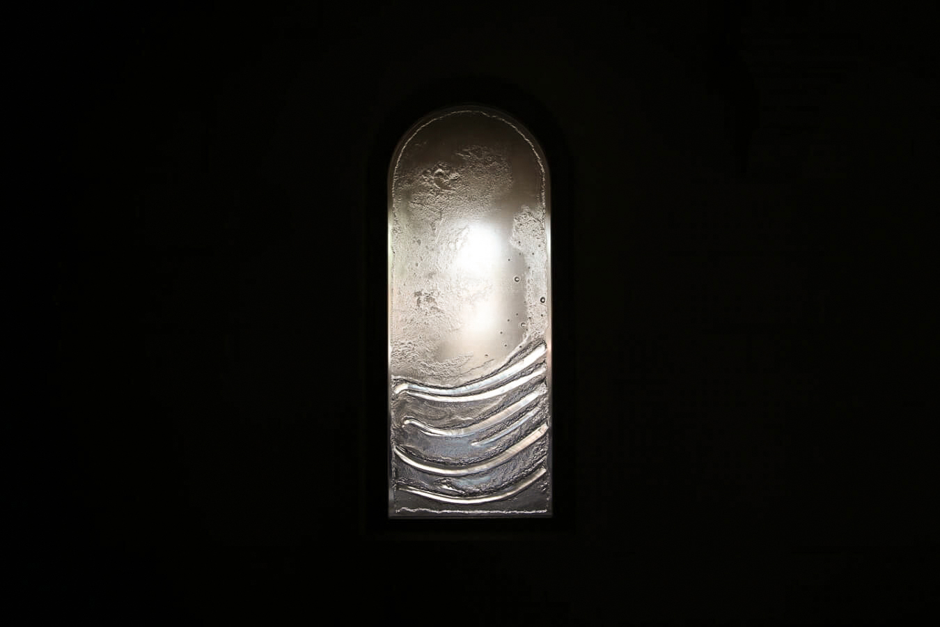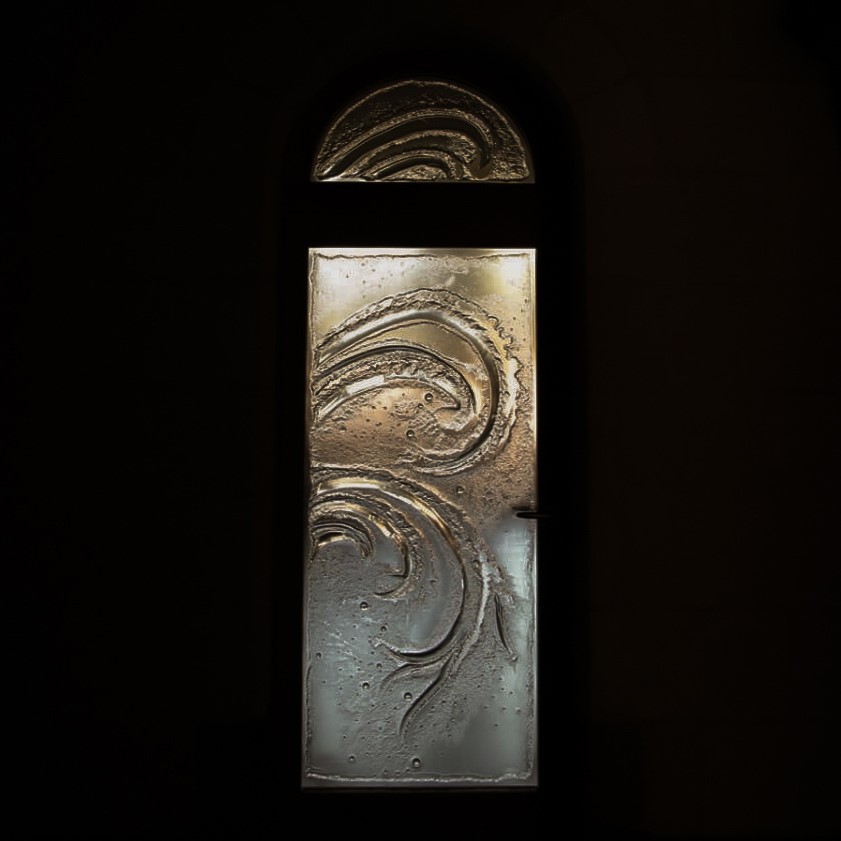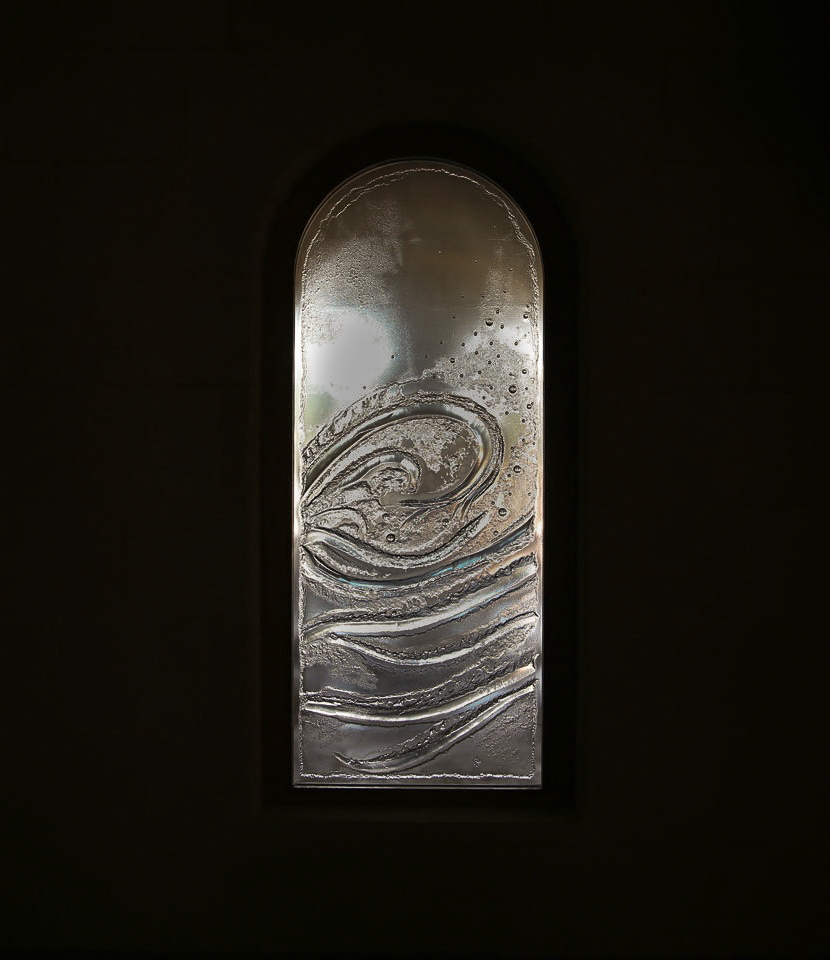 L’artiste a alors proposé une création en verre thermoformé plutôt qu’un vitrail classique avec sertissage en plomb. Sur un lit de plâtre très fin, le motif est sculpté à la main. On pose ensuite dessus, sans le toucher pour ne pas le faire s’effondrer, une très épaisse plaque de verre qui va venir se coucher dans la sculpture, extrêmement lentement et sans déformer le dessin. Après cuisson le verre qui est d’un seul tenant est complètement en relief.