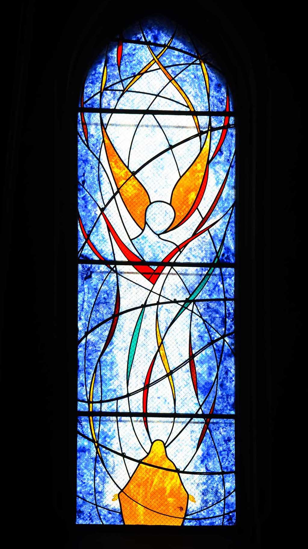Les vitraux du baptistère figurent la Trinité. Ceux de la façade la pêche miraculeuse et l’envoi en mission. Les lancettes quand à elle représentent une Annonciation et l’amour divin. Tous ces vitraux ont été réalisés avec le concours de l’Atelier Vitraux Max de Noyon.
