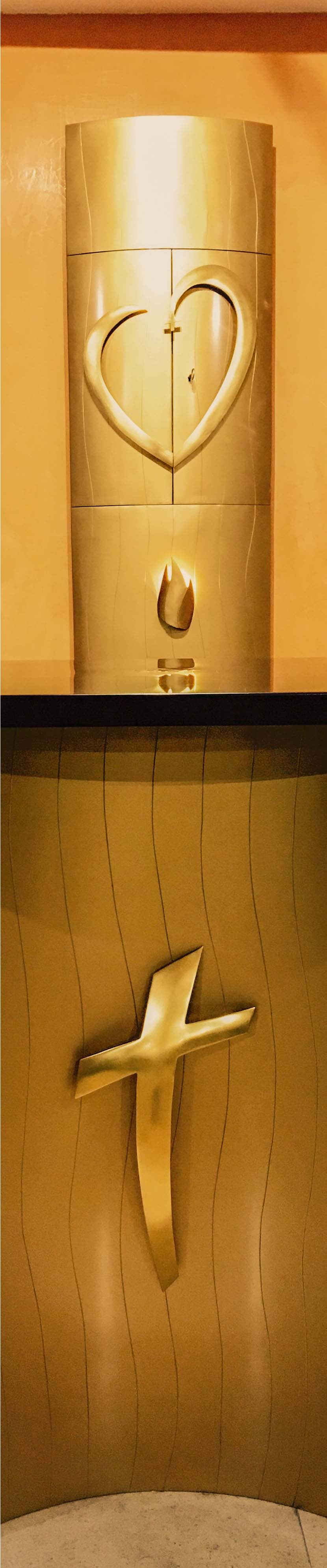 Devant chacune de ces lames dorées prend place un élément spirituel. La croix devant l’autel car à chaque communion c’est le christ qui s’offre. Sachez que l’autel contient également comme le veut la tradition, une relique du frère Charles.