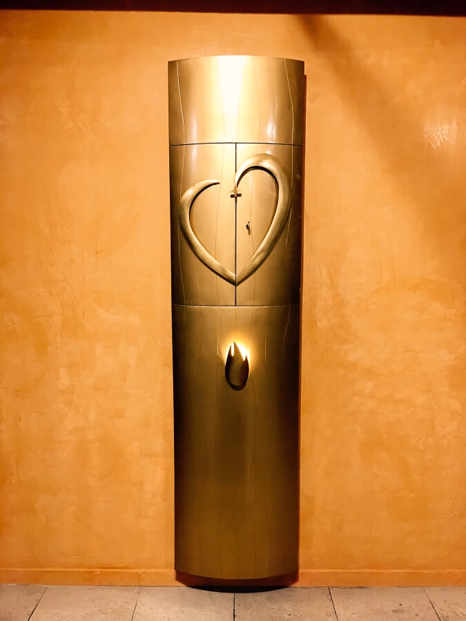 Je crois être restée médusée plusieurs minute de ce hasard incroyable. J’en aurais presque cherché les grains de sable sur le sol de la bibliothèque ! Le symbole du cœur s’est ancré en moi à ce moment là. Je l’ai porté autour du cou de longues années. C’est pour cela que vous le retrouverez dans l’oratoire à maints endroits : gravé sur l’autel, creusé dans le bois des fauteuils, sculpté sur le tabernacle et l’ostensoir. C’est le cœur sacré du Christ, c’est le rappel que Dieu est immensément amour, que c’est non pas la beauté qui sauvera le monde mais l’amour… J’espère que tout ceux qui passeront par ce lieu sauront voir, revoir, et démultiplier l’amour dans leur vie.