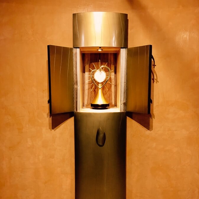 Il faut savoir que cet ostensoir est unique. Qu’il n’en existe probablement aucun autre de ce type, le père Marc m’a demandé qu’il réunisse à la fois une pyxide et une monstrance, c’est a dire à la fois un ciboire sans pied et un ostensoir et donc la réserve des hosties et la grande hostie d’adoration. C’est donc Jésus tout entier, présent dans une église, qu’il vous sera donné de venir rencontrer et prier.
