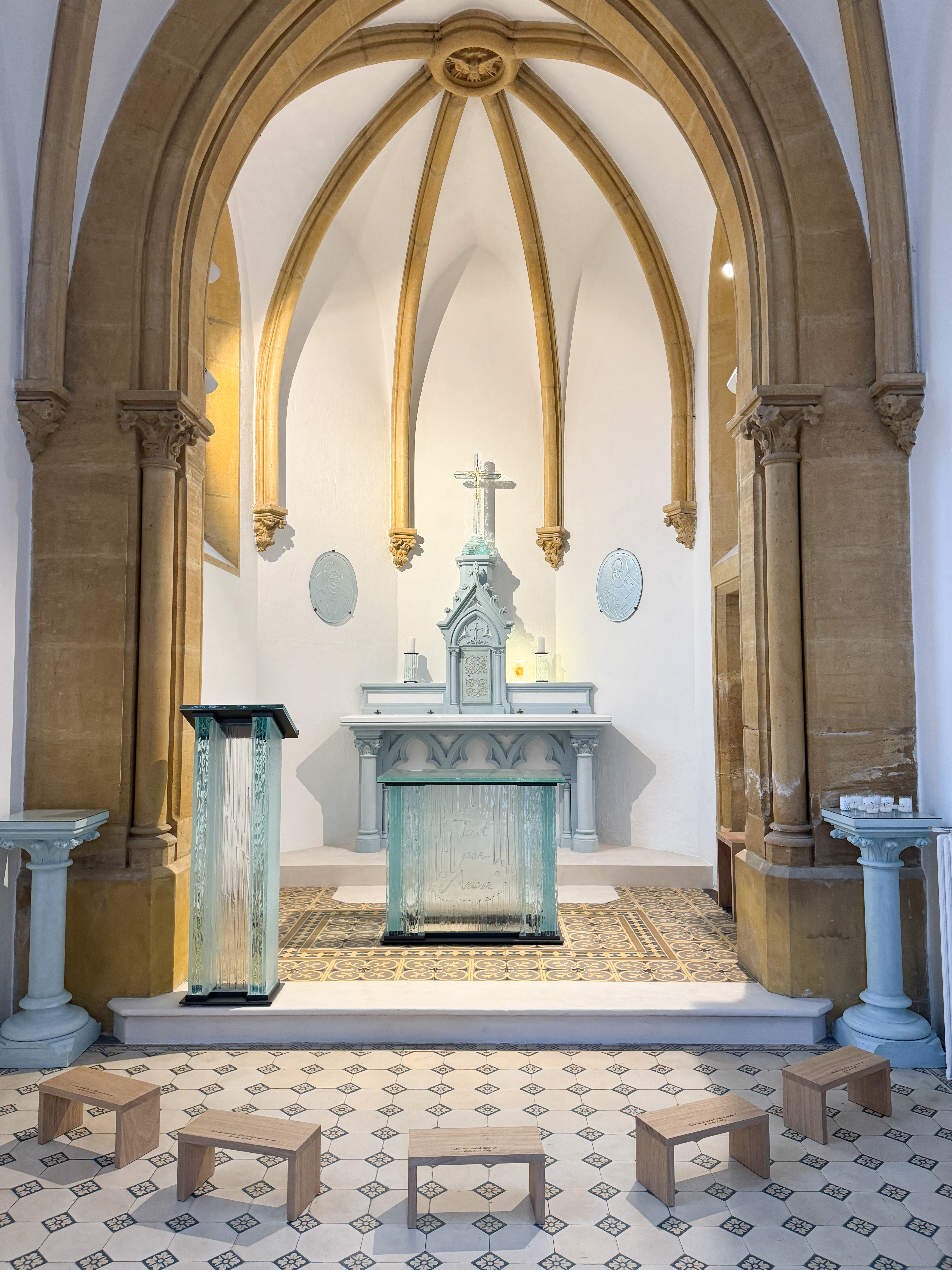 La chapelle du Foyer Carré de Malberg a été complètement transformée. D’abord rafraîchie dans ses peintures, passant du jaune moutarde au bleu frais, elle s’est vue ornée de tout un ensemble de mobilier en acier et verre détonné : un autel, un ambon, les portraits de la fondatrice Caroline Carré de Malberg et de Saint-François-de-Sales, une croix reliquaire contenant une relique de saint François de Sales et de sainte Jeanne de Chantal. La patine du tabernacle a été revue et des bancs de prière complètent l’ensemble. Une démarche globale qui a voulu conserver l’aspect fin et précieux de cette jolie chapelle, tout en emmenant l’héritage de Caroline Carré de Malberg au 21ème siècle.